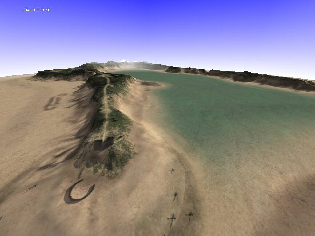 As you can see in the shots, framerates are quite comfortable, especially knowing that in-game fog is closer, that anisotropic filtering was active and no frame-to-frame coherency is exploited. This leaves a lot rendering capacity for water, buildings, vehicles & other stuff. With full-detail (no ROAM), framerate goes down to 170-200 FPS, which may be what the game uses (full geometry) with its reduced fog distance.